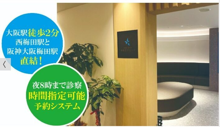 場所は大阪メトロ四つ橋線西梅田駅から徒歩すぐの場所に位置しており、平日は20時まで、土曜日も13時まで診療しています。