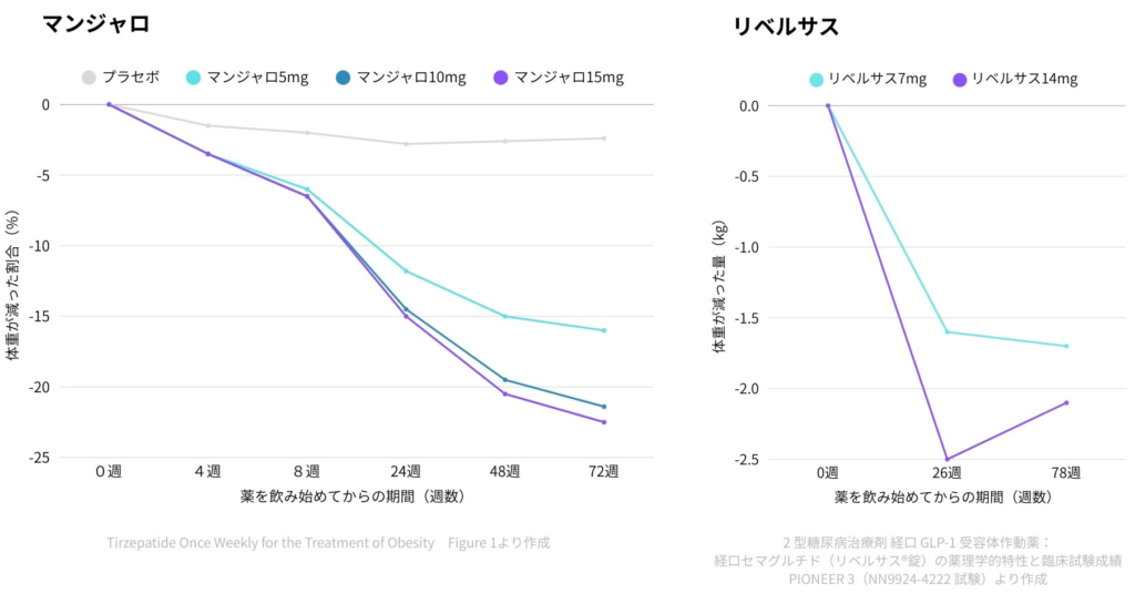 マンジャロとリベルサスはそれぞれ作用機序が異なる薬であるため、単純にダイエット効果を比較することができません。