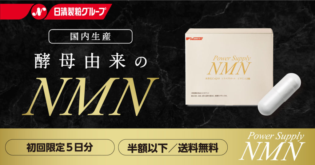 | パワーサプライNMN (日清ファルマ) | ![]() | ・安心の日清製粉グループの高純度NMN ・コエンザイムQ10、レスベラトロール、各種ビタミンも配合 | 日本製 | 不明 | 高価格帯 | 5パック入り (約5日分) | NMN純度 99%以上 125mg(※3)/1粒あたり 625mg/総配合量 | 14,310円 | 1,350円※4 |